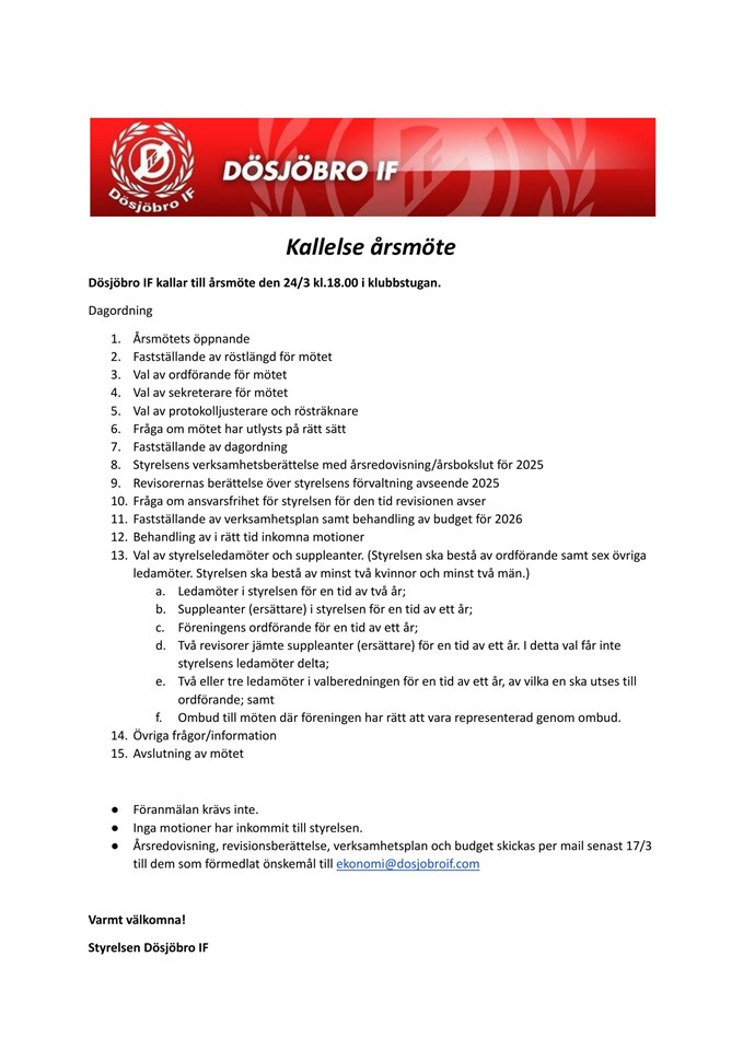 Klicka på bekräftelselänken i det mejl vi skickat dig för att börja ta emot uppdateringar från Dösjöbro IF.