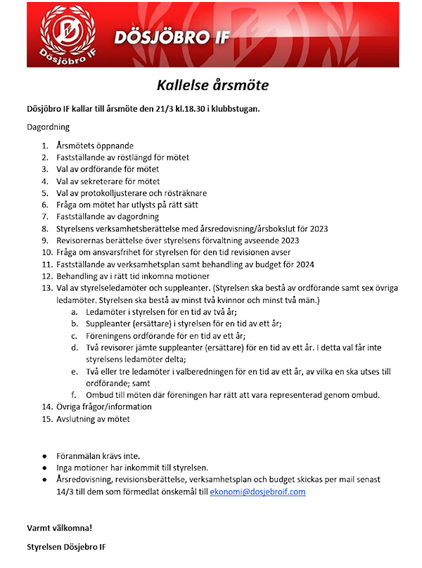 Dösjöbro IF kallar till årsstämma den 21/3 kl 18.30 i klubbstugan. Se bifogad kallelse för dagordning.